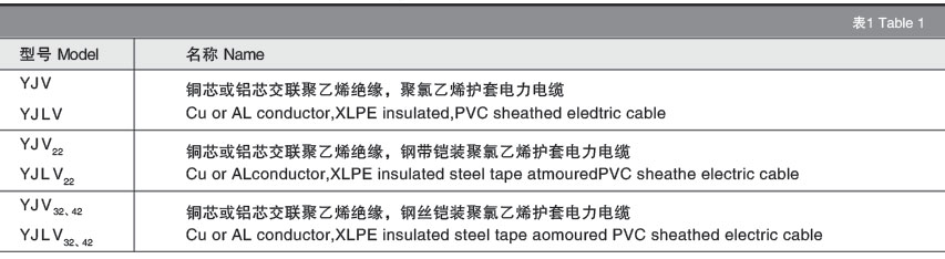 2 电力电缆型号及名称(见表1)Model and name (see table l)