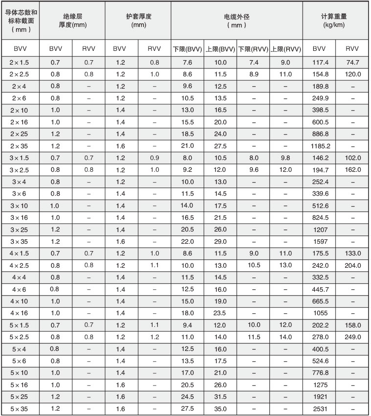 表 4 60227IEC10(BVV) 60227IEC53(RVV)