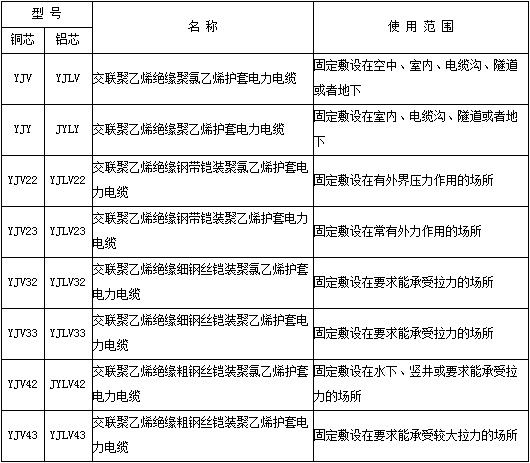 三、聚乙烯绝缘电力电缆型号、名称和使用范围: